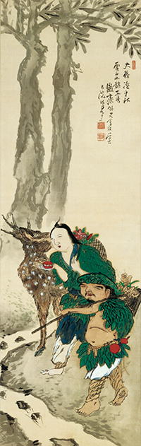 今展の注目は、ポスターにもデザインされている色彩鮮やかな三幅対の『寿山福海図』。海を渡り、仙境に向かう仙人たちの群像二幅と仙境図一幅という見ごたえのある大作で鉄斎64歳の作品です。72歳の作品『神仙採薬図』(左上の図版)も色彩が美しい作品で、左幅は薬草を採る仙人と仙女、右幅には寿老人が見える仙境が描かれています。2作品とも鉄斎美術館では十数年ぶりの公開となる名作、じっくりと味わってみたいものです。