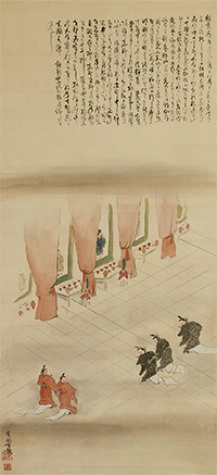 鉄斎のやまと絵の代表的な作品のひとつ、対幅の『大嘗会図・釈奠図』のうち「釈奠図」(左)は奈良時代に唐から伝わった孔子など儒教の先師を祀る儀式で、日本では平安時代に儀式化され、その様子を鉄斎も書物から学び描きました。賛には儀式の内容が記され、宮中での厳かな様子を垣間見ることができます。掛幅の『始献牛乳図』は日本で初めて牛の乳を搾る役人を描いた珍しい作品です。